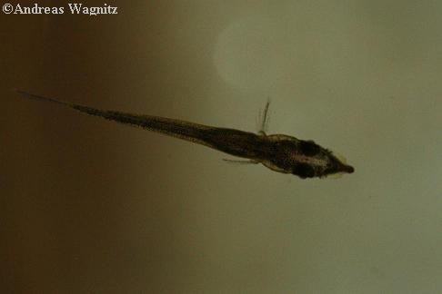 Der gleiche Jungfisch von oben, etwa 1 cm lang. Der Schnabel ist noch