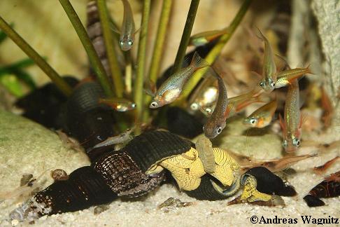 Oryzias woworae lebt auf der Insel Muna, die sich südöstlich von Sulawesi befindet. Ein hübscher kleiner Fisch der mit ca. 4 cm ausgewachsen ist. Ich halte sie in einem Aquarium mit den Maßen 60x30x40, zusammen mit einer gelb-schwarzen Tylomelania spec. und Caridina caerulea. Die Vergesellschaftung funktioniert sehr gut, auch wenn die O. woworae eventuell einige Junggarnelen verspeisen kommen noch genügend Tiere durch.